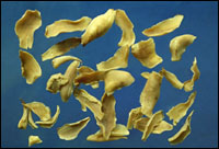 【生药材鉴定】:干燥的鳞叶,呈长椭圆形,披针形或长三角形,长约2~4厘米,宽约0.5~1.5厘米,肉质肥厚,中心较厚,边缘薄而成波状,或向内卷曲,表面乳白色或淡黄棕色,光滑细腻,略有光泽,瓣内有数条平行纵走的白色维管束。质坚硬而稍脆,折断面较平整,黄白色似蜡样。气微,味微苦。以瓣匀肉厚、色黄白、质坚、筋少者为佳。药用百合有家种与野生之分,家种的鳞片阔而薄,味不甚苦;野生的鳞片小而厚,味较苦。同属植物如:卷丹(《纲目》)(东北)、山丹(《食疗本草》(详“山丹”条)、山百合(《植物名实图考》)(云南)、松叶百合、渥丹(《花镜》)、赛渥丹(东北)、轮叶百合、高原卷丹(西北、西南)、野百合(新疆)等,均可入药。显微鉴定: (1)卷丹 粉末灰白色。①商品淀粉粒多已糊化。未糊化淀粉粒长卵形、类圆形、肾形或不规则形,有的一端或两端较尖,直径3-29μm,长至46 μm;脐点不甚明显,人字状或短缝状,多位于较小端;层纹隐约可见。②表皮细胞垂周壁稍增厚,有的呈连珠状。气孔类圆形,直径61-69μm,副卫细胞3-5个。③螺纹及网纹导管直径8-30μm。(2)百合 ①未糊化淀粉粒长卵形或长圆形,两端钝圆或稍平截,有的一边角样突起,直径5-50μm,长至88μm,脐点人字状、马蹄状或三叉状,层纹较明显。②表皮细胞壁薄,微波状。气孔类圆形者直径51-61μm,扁圆形者直径56-67μm,长圆形者直径40-48μ m,长45-61μm,副卫细胞3-5个。(3)山丹(细叶百合)①未糊化淀粉粒类卵圆形、椭圆形、梨形或略呈贝壳形,较小端稍尖突,有的一边或两边角样突出,直径3-50μm,长至72μm,脐点人字状、点状或短缝状,层纹隐约可见;复粒由2-4分粒组成,分粒大小悬殊;偶见半复粒。②表皮细胞壁波状弯曲。气孔类圆形,直径44-52μm,副卫细胞4-5个。