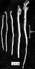 2、马蓝根:根茎呈圆形,多弯曲,长5~10cm,直径 1~5mm,有时分叉。一面灰棕色,膨大的节上着生细长略弯曲的根,节的上方残留短的地上茎,茎上有对生分枝。质脆,易折断,断面不平坦,中央有髓。细根稍柔韧。气弱、味淡。