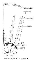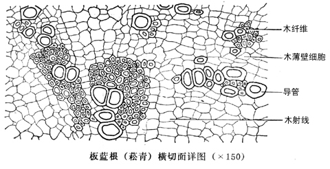 2、马蓝根茎(直径3mm) 横切面:表皮为一列细胞,皮层细胞切线延长,有小纹孔。韧皮部有多数纤维散在,微木化。 木质部细胞均木化,导管单个或2~4个成群径向排列,木射线宽2~6列细胞,有纹孔。髓部薄壁细胞有小而密的纹孔。 皮层、韧皮部薄壁细胞以及髓细胞中均含有圆形或椭圆形的钟乳体。细根皮层、髓细胞中亦有含钟乳体细胞散在。 茎的皮层外侧细胞较小、厚角化。