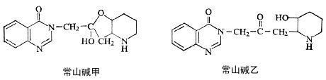 1.蜀漆 为常山的枝梢及叶,亦有抗疟效力。含总生物碱0.6~1.0%,茎中含量较少,其所含生物碱与常山根的主要生物碱相同。常山叶的生物碱含量在不同季节变化较大,其平均值如下: