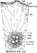 根(直径约1mm)横切面:表皮细胞少数残存,壁略木栓化,棕黄色。皮层宽广,外皮层细胞与表皮细胞上下交错排列;下方为1列小形木化厚壁细胞,4~6角形;其内为多列薄壁细胞,放射状排列,多数细胞分离解体,形成大的气腔,仅有细胞壁残存,近内皮层的薄壁细胞小而排列整齐;内皮层细胞侧壁和内壁木化增厚。中柱鞘为1列薄壁细胞;初生木质部多原型,韧皮部束位于木质部弧角间,后生木质部有5个大导管,木纤维发达。髓部细胞壁厚,木化。