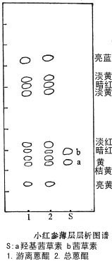 2.薄层层析 样品制备:取本品粉末0.1g,加甲醇液5ml冷浸1小时,过滤,稍浓缩,点样(供游离蒽醌鉴定)。取理化鉴别项1中的乙醚液点样(供总蒽醌鉴定)。吸附剂:硅胶G(北京化工厂)制板。展开剂:二甲苯-甲酸乙酯-己烷-甲酸-甲醇(20:10:8:1:0.5)加蒸馏水0.5ml振摇,分取上层溶液。展距12cm。日光下茜草素及羟基茜草素呈紫红色,在氨蒸气下紫色加深。于荧光灯(365nm)下观察斑点颜色。