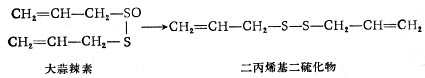 大蒜辣素为具挥发性的无色油状液体,具蒜的强烈臭气,对皮肤有刺激性,性质不稳定,在一般蒸馏条件下,即可分解成具蒜臭的二丙烯基二硫化物(Diallyl disulfide)及基类似物,其通式为C3H5-Sn-C3H5,(n=1,2,3,4)。上海第二制药厂自大蒜挥发油中分得的二丙烯基三硫化物(大蒜新素)属此类化合物,前曾定为二丙烯基硫代磺酸酯,具较强的抗菌作用。