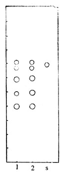 3. 薄层层析 样品制备:取样品粗粉1g,加甲醇30ml,加热回流6小时,滤过,滤液蒸干,残渣溶于20ml水中,用乙醚提取2~3次,醚液弃去,水层再用水饱和的正丁醇提取3次,合并正丁醇提取液,最后将正丁醇液减压浓缩蒸干,残渣用少量甲醇溶解,供点样用。以皂角甙C(G Sa C)作对照品。吸附剂:硅胶G。展开剂:正丁醇-乙醇-氨水(10:2:5)。展距16cm。显色剂:20%磷钼酸乙醇试液。喷雾后,于120℃烤10分钟,斑点显不同程度深兰色。