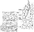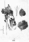 叶表面观:上表皮细胞垂周壁波状弯曲,外壁有角质层纹,呈断续波状;下表皮细胞与上表皮相似,但细胞较小,角质层纹不明显。上、下表皮均有腺鳞和腺毛,下表面为多,腺鳞的腺头扁圆形,由8个细胞组成,其外有角皮,内贮黄色油滴,直径44~104μm,破裂后呈不规则三角形,柄为单细胞;腺毛的腺头为1~2个细胞,柄为单细胞。两面均有非腺毛,尤以叶脉处为多,由2~4(~6)个细胞组成,中部细胞有时缢缩,长80~360(~980)μm,基部直径30~100μm。气孔直轴式,下表面比上表面多。(上图,图左,图右)