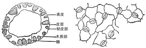 左:一点红茎横切面简图(×13)右:一点红叶下表面观
