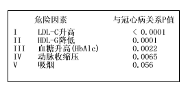 进入上世纪90年代,尤其是1993年以后,在2型糖尿病患者中开展的多项前瞻性临床研究结果的发表极大地改变了对高血糖与心血管危险之间关系的认识。其中最重要的是具有里程碑意义的UKPDS研究。UKPDS共纳入2693例、年龄在25~65岁之间的新诊断的2型糖尿病患者。观察性研究结果表明:包括心肌梗死、脑卒中、周围血管病变等的大血管病变发病率的降低与强化血糖控制明显相关(P<0.05),但是临床随机对照研究的结果并没有得出类似的结论(P>0.05)。尽管如此,UKPDS研究仍然表明:在2型糖尿病患者中,高血糖与卒中及心衰发生率相关,但与高血压关系更密切。而且UKPDS研究同时表明:在糖化血红蛋白(HbA1c)<6%时,心肌梗死发生率已经高于微血管病变的发生率。此外,UKPDS研究还对常见心血管危险因素进行分级,发现在冠心病中,高血糖是仅次于高血脂(高LDL-C、低HDL-C)的危险因素(图1)。