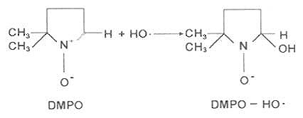 ·OH在水中寿命很短,一般不易以自旋共振(ESR)方法检出,有人利用DMPO(5,5-二甲基-1-吡咯啉-N-氧化物)作自旋捕获,成功地检出白细胞内产生的·OH,因DMPO与·OH形成一个较稳定的加成物DMPO-HO·。另外也可采用生物反应检出。