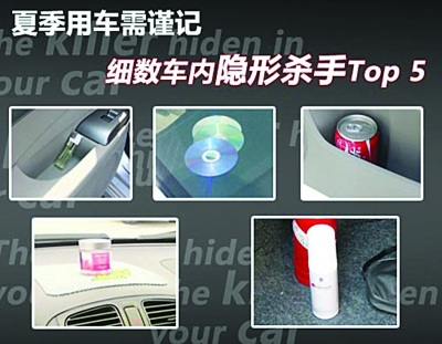 CD光盘在车内高温时会散发出有毒气体、打火机放在车头挡风玻璃下暴晒随时会发生爆炸、就连碳酸饮料易拉罐也会因为车内高温而发生爆炸……近日南京市区最高气温已超30℃,夏季高温下用车,一些看似安全、美观的车内用品在夏季也会变成你车内的隐形杀手,有的会令车辆自燃,有的会令开车人健康受损,更有甚者还会带来血光之灾,这绝对不是危言耸听。南京公安局白下分局官方微博昨天就发布消息,列出了上述夏季车内的“隐形杀手”。