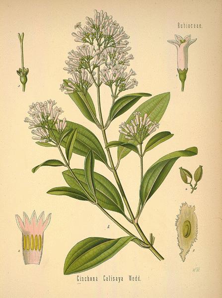 金鸡纳霜,奎宁的俗称,由金鸡纳树的树皮研磨而成,图为金鸡纳树。