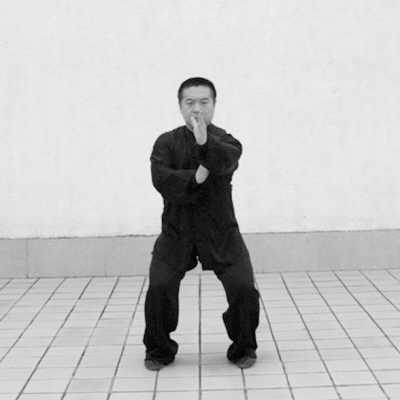 动作:1.坐腕起手:两脚平行与肩宽,手腕下沉,翘指,目视前方(如图1)。2.屈膝举臂:屈膝下蹲,同时两掌举于胸前,两掌心相对(如图2)。3.左右开手:第一个动作是“夹马收掌”,碾脚掌,脚跟外移,两脚内扣“八”字;同时,两掌同时向外侧旋转,屈肘收臂,虎口对肩峰,掌心向上(如图3)。第二个动作是“左转开掌”,右脚不动,左脚以脚跟为轴,脚尖外摆约135度,身体左转约45度,两腿呈弓步状,同时左掌向左推出,右掌向右45度角方向推出,目视左前方(如图4)。4.胸前合手:左脚以脚跟为轴,再扣回135度,呈“八”字夹马势,右脚不动,两掌收回肩前(如图3);然后碾脚跟相对内合,两脚平行与肩宽,同时两掌合于胸前,恢复起势(如图2)。接下来再向右侧开掌。循环练习。