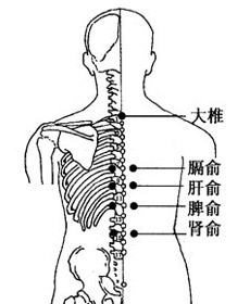4、肝俞穴:肝俞穴位于背部,第9胸椎棘突下,旁开1.5寸,是肝的背俞穴,是肝的元气在身体背部汇聚而成的“水潭”,肝俞是养肝不可缺少的养生要穴。肝俞与太冲搭配,在中医里属于“俞原配穴”法,能够补肝阴,养肝柔肝。它的取法是俯卧位,在第九胸椎棘突下,筋缩(督脉)旁开1.5寸处取穴。