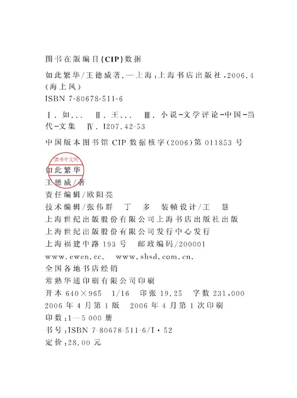 《如此繁华》本书原在香港出版,收于刘师绍铭主编的天地出版公司散文系列——虽然绝大部分的文字都是学术论文。承蒙华东师范大学罗岗教授、上海书店出版社王为松先生的热心主催,现在推出简体版本,内容方面也有所更动:增加了论述北京的文字,论上海和台北的部分则重新编订。谨此,再向刘绍铭教授、天地出版公司颜纯钩先生、罗岗教授、王为松先生,敬致谢意。