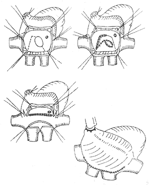 5.Damas-Kaye-Stanel术 不需冠状动脉移植,在肺动脉分叉处横断肺总动脉,近端整修为斜口,主动脉后外侧从切开与近端肺总动脉作端侧吻合。经右心室流出道切口将室间隔缺损修补,主动脉瓣沿瓣环用涤纶补片将右心室流出道封闭,用带瓣外导管架于右心室和远端肺动脉之间。并发症有带瓣外导管的钙化、失灵、梗阻和心力衰竭。