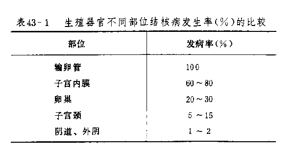 4.由于各种原因而用手术切除的输卵管,经病理检查发现有结核病灶者,自2%至20%不等。除报道数字来自不同地区这个因素外,发病率的差异与病理检查是否仔细有重要的关系。因肺结核而死的妇女,经尸检证实有生殖器结核者约占4%~20%不等,这个数字即与病理检查是否仔细有显著关系。目前在我国尸检的资料甚少,而在一些较常做尸检的国家,则因肺结核而死亡的人数日渐减少,故这方面的资料已极少见到。