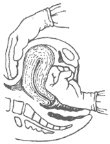 1.宫缩乏力 加强宫缩是治疗宫缩乏力最迅速有效的止血方法。助产者迅速用一手置于宫底部,拇指在前壁,其余4指在后壁,作均匀有按摩宫底,经按摩后子宫开始收缩(图2),亦可一手握拳置于阴道前穹窿,顶住子宫前壁,另一手自腹壁按压子宫后壁,使子宫体前屈,两手相对紧压子宫并作按摩(图3)。必要时可用另手置于耻骨联合上缘,按压下腹正中部位,将子宫上推,按摩子宫必须强调用手握宫体,使之高出盆腔,有节律轻柔按摩。按压时间以子宫恢复正常收缩,并能保持收缩状态炎止,使之高出盆腔,有节律轻柔按摩。按压时间以子宫恢复正常收缩,并能保护收缩状态为止。在按摩的同时,可肌注或静脉缓慢推注催产素10U(加入20ml10%~25%葡萄糖液内),继以肌注或静脉推注麦角新碱0.2mg(有心脏病者填用)。然后将催产素10~30U加入10%葡萄糖液500ml内静脉滴注,以维持子宫处于良好的收缩状态。