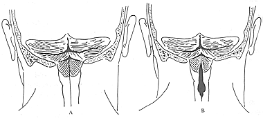 小脑扁桃体疝是由于后颅凹中线结构在胚胎期的发育异常,其主要病理变化为小脑扁桃体呈舌状向下延长,与延髓下段一并越出枕骨大孔而进入椎管内,与其延续的桥脑和小脑蚓部亦随之向下移位,亦可能造成导水管和第四脑室变形,枕大孔与椎管始部的蛛网膜下腔狭窄等一系列变化。扁桃体疝有的低至枢椎或更低水平。重型者,可见部分下蚓部也疝入椎管内。由于上述的改变,使舌咽、迷走、副、舌下神经等脑神经,上部颈脊髓神经根被牵下移;枕大孔和颈上段椎管被填塞引起脑积水。本病若与脊髓脊膜膨出、其他枕大孔区畸形伴发,则症状出现较单纯者早而重。依据病理变化可分为A型(合并脊髓空洞)及B型(单纯扁桃体疝)(图1)。