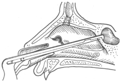 3.试验穿刺 先用含1‰肾上腺的1%的卡因棉片使中鼻道收缩,并行粘膜表面麻醉,再用5号长针头刺入筛泡,注入少量灭菌生理盐水,抽出,检查是否混浊,也可做细菌培养和抗生素敏感试验。此法有一定难度和危险性,须由有经验的医师操作。