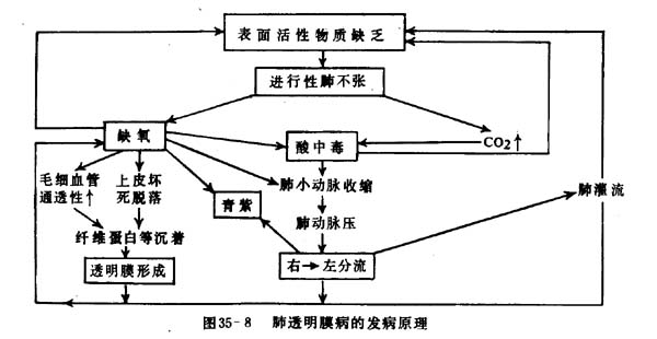 一、肺泡表面活性物质不足 表面活性物质是一种脂蛋白,蛋白占10%、脂质占90%,主要是卵磷脂即磷脂酰胆硷。它由Ⅱ型肺泡细胞合成,20周时肺匀浆内浓度高,22~24周时出现在Ⅱ型细胞内,28周后可出现于羊水中。35周前只由甲基转移酶途径产生,其量不多,又易受缺氧、酸中毒、低温的影响。35周(32~36)后磷酸胆硷转移酶途径成熟,才能产生大量较稳定的表面活性物质。它能降低表面张力,使肺泡张开,呼气后常保留一定量的残气,不致萎陷。其半衰期为10~16小时。在肺泡张开过程中被消耗,需要不断补充。胎儿肺泡内含液体约30ml/kg,一部分通过产道时挤压而出,一部分出生后被肺间质吸收。肺泡内液体与空气接触面有表面张力,吸气时肺泡半径增大,表面张力降低,呼气时肺泡半径缩小,表面张力增高。而覆盖于肺泡表面的表面活性物质能降低呼气时增高的表面张力,因此肺泡才不会萎陷。表面张力T与肺泡半径r的关系如下:P=2T/r。因表面活性物质不足,故表面张力T增高,肺泡回缩力P加大导致肺泡萎陷,呼气时半径r最小的肺泡的P值最大,因此最先缩小、萎陷,其呼出的气体进入邻近较大的肺泡。以后呼气时,半径最小的肺泡又再缩小、萎陷。如此反复不已就产生了进行性呼气性肺不张,使气体交换越来越少,缺氧与酸中毒越来越重。缺氧时糖无氧酵解,导致乳酸增加,造成代谢性酸中毒;通气不足使CO2潴留,造成呼吸性酸中毒。缺氧与酸中毒引起肺小动脉收缩,使肺动脉压力增高,导致卵圆孔和动脉导管的右向左分流。上述肺外右向左分流与此肺内分流的血量可浪费80%的心搏出量,这是本病引起严重缺氧与青紫,即使吸入纯氧也不易改善的主要原因。由于严重缺氧、肺小动脉收缩,随后终末细支气管及肺泡管上皮细胞坏死脱落,从邻近毛细血管漏出液体中的纤维蛋白原在组织凝血活酶的作用下凝固为纤维蛋白,网罗了坏死的细胞碎屑而形成透明膜。此膜粘附于肺泡及呼吸细支气管壁上,更阻碍了气体的交换。缺氧、酸中毒、肺灌流不足又进一步影响表面活性物质的合成,因而形成恶性循环。