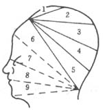 1.枕左(右)后位 胎头枕部到达中骨盆向后行45°内旋转,使矢状缝与骨盆前后径一致。胎儿枕部朝向骶骨成正枕后位。其分娩方式有两种:①胎头俯屈较好:当胎头继续下降至前囟抵达耻骨弓下时,以前囟为支点,胎头俯屈使顶部及枕部自会阴前缘娩出。继之胎头仰伸,相继由耻骨联合下娩出额、鼻、口、颏[图1(1)]。此种分娩方式为枕后位经阴道助娩最常见的方式。②胎头俯屈不良:当鼻根出现在耻骨联合下缘时,以鼻根为支点,胎头先俯屈,从会阴前缘娩出前囟、顶及枕部,然后胎头仰伸,使鼻、口、颏部相继由耻骨联合下娩出[图1(2)]。因胎头以较大的枕额周径旋转,胎儿娩出更加困难,多需手术助产。