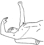 在作肾上腺手术时,应注意以下几点:①切口的选择:可经第11肋间切口进行,但术中需更换体位,部分肾上腺皮质腺瘤病人误诊为肾上腺皮质增生时,则发生困难。病人肥胖,经腹部探查双侧肾上腺较困难。比较合适的是病人全麻下取俯卧位,经背部八字切口(Nagamatsu切口(图1),或经第11肋切口探查。一般先探查右侧,如发现右侧肾上腺增生(双侧肾上腺增生)或萎缩(左侧肾上腺皮质腺瘤),则需再探查左侧肾上腺。如发现右侧肾上腺皮质腺瘤则可作腺瘤摘除,不需再探查左侧。巨大的肾上腺腺癌可选用胸腹连合切口进行手术(图2)。②皮质激素的补充:皮质醇症患者体内皮质醇分泌处于一高水平,术后皮质醇水平骤降易导致急性肾上腺皮质功能不足所致的危象。其临床表现为休克、心率快、呼吸急促、紫绀、恶心呕吐、腹痛、腹泻、高热、昏迷甚至死亡。故于术前、术中和术后均应补充皮质激素以预防。一旦危象发生,应快速静脉补充皮质激素,纠正水电解质紊乱以及对症处理。情绪波动、感染以及某些手术并发症可诱发危象发生,并有时会混淆诊断(如气胸、出血等),应予注意避免发生。