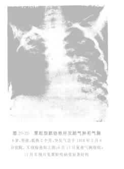 体格检查往往缺少明显体征。少数患儿晚期在肺部可听到细湿罗音。约半数小儿可有全身淋巴结、肝、脾肿大。急性粟粒型肺结核特点为呼吸道症状、肺部体征和X线检查的不一致性,即呼吸道症状多不明显,肺部缺乏阳性体征,但X线检查变化明显。肺X线片可见在浓密的网状阴影上密布均匀一致的粟粒结节(图20-19)。婴幼儿由于病灶周围反应显著和易于融合,点状阴影边缘模糊、大小不一而呈雪花状。病变急剧进展时可形成空洞,有时可见蜂窝性肺气肿、肺大疱、自发性气胸(图20-20)、纵隔气肿和皮下气肿等。临床上一般须在症状出现1~3周后才能见到典型X线改变。眼底检查34%患儿发现脉络膜结核结节。少数患儿可见皮肤粟粒疹,均可协助诊断。化验检查白细胞可减低或升高,约40%患儿白细胞升高,有时可达20×109/L(20000/mm3)以上,伴有粒性白细胞增多及核左移,少数患儿有类白血病反应。我们曾见到有呈再生障碍性贫血及血小板减少性紫癜以及反应性网状内皮细胞病表现者。血沉多加快,胃洗出液中容易找到结核杆菌。