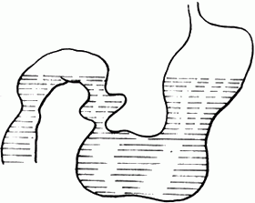 2.胃肠钡剂造影:表现为胃扩张、下垂,胃内有大量空腹滞留液,排空时间延长;十二指肠球部匀称扩大、伸长,其下缘光滑圆隆;十二指肠隆段,偶尔在第一段或第三段出现边缘整齐的局限性狭窄区,且该区粘膜皱襞稀少,狭窄上方的肠管可见逆蠕动(图2)