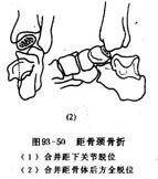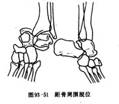 1.距骨周围脱位 距骨仍位于踝穴内,胫距关节保持正常关系,距下关节的骨间韧带被撕裂,距下关节和距舟关节同时向内脱位(图93-51)。闭合复位并不困难,牵引前足及后跟,将足强度跖屈,将足外翻外展,可得到整复。复位后用石膏固定于中立位6周。