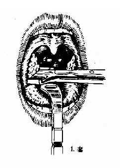 2.操作:病人取仰卧或坐位,助手将其头部固定,置入开口器后,手术者以压舌板压舌,暴露扁桃体下极,右手持挤切刀,从扁桃体下极套入,再转动刀环,使其位于扁桃体和咽腭弓之间,将扁桃体后面及上极套入,并向舌腭弓方向提起,这时扁桃体在舌腭弓下隆起成一“包块”,即用左手拇指或食指将“包块”挤压入环内,随即收紧刀柄,推动刀杆前进,使刀片切入刀环的尽端,以迅速有力的扭转及提拔动作切下扁桃体。以同法切除对侧扁桃体。助手迅速将患者头部侧转,使其将血吐出。止血方法同剥离法。