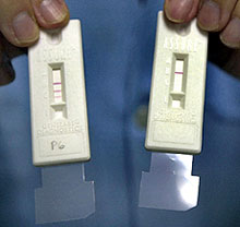 如果血清里有沙斯抗体,抗体就会和病毒蛋白质产生反应,检测器会出现两条至三条红线(左)。反之,检测器只有一条红线(右)。
