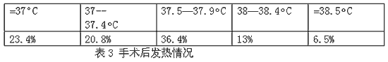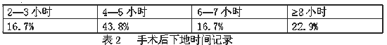手术后下地时间最早的为术后2小时30分。60.5%的病例在六小时以内离床。见表2