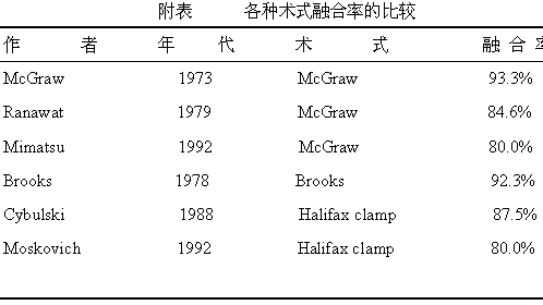 寰枢椎后路融合术以McGraw 和Brooks 术式最常用,1984年以后又出现了椎板夹( Halifax Clamp )固定融合术。这些方法都是在寰椎后弓与枢椎椎板间放置髂骨块,然后用钢丝或螺钉拧紧夹片将寰枢椎后部结构和骨块固定在一起。本方法和传统方法不同的是放弃整块的以皮质骨为主体的植骨块。而改用呈颗粒状的松质骨植入,不用内固定而用头环背心外固定。我们的方法获得了93.5%的融合率,高于传统方法的融合率(附表)。