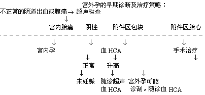 四、诊断性刮宫:异位妊娠有时不易与宫内妊娠发育不良区别。如二者均可有停经、阴道流血、血hCG的升高及血孕酮水平的异常、B超检查宫腔内无妊娠胎囊、可有或无附件包块。诊断性刮宫如肉眼发现绒毛或显微镜下检查发现绒毛即可诊断为宫内妊娠。无未发现绒毛,则应考率异位妊娠或宫内妊娠完全流产。刮宫后观察血hCG的变化有利于诊断。如果hCG持续升高或不变,异位妊娠可以诊断,应进行治疗。如果血hCG滴度逐渐下降,可以继续观察直到血hCG恢复至正常。