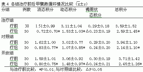 3.4 治疗前后甲襞微循环情况比较:流态积分、动态积分、总积分治疗后与治疗前比较,各组差异均有显著性(p均0.05)。疗后组间比较动态积分对照组优于另两组(P均0.05)。见表4。