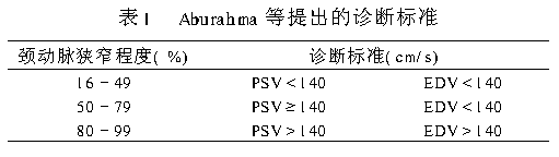 如预先未做血管造影而行内膜切除术,建议ICA的PSV≥254cm/s,因其PPV为95%。另外,对于特殊情况,当一侧颈动脉狭窄>50%时,评价对侧颈动脉狭窄时,Aburahma等曾提出诊断方法,其准确率达97%(见表1)。