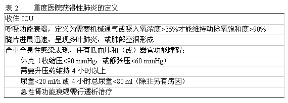 美国胸病学会(American Thoracic Society, ATS)有关重度医院感染肺炎诊断标准见表2。