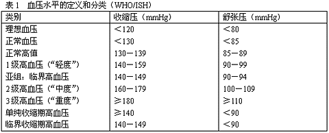 根据1999年10月公布的中国高血压防治指南的分类标准。它将18岁以上成人的血压,按不同水平分类如表(1)