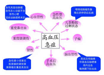 高血压脑病及恶性高血压可发生在任何类型的高血压病人。高血压脑病更易发生在平时血压“正常”的高血压病人;恶性高血压可不伴脑病,高血压危象可发生在服交感胺及有停药征候群的病人中,此外还可出现在脑出血、高血压急性左心衰及急性夹层动脉瘤等病人中。3 “高血压紧急状态”urgencies,为无明显症状及靶器官损害,但病人血压呈重度升高。上述1、2类情况时均需紧急静脉用药,而在3时则只需立即口服短效降压药治疗(见表1、2)。