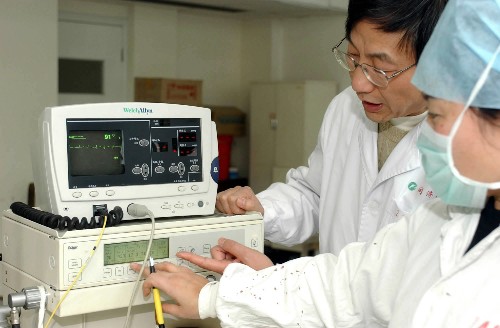 2月11日,武汉同济医院器官移植研究院的陈忠华院长(后)在观察无头动物模型的心电图。当日,武汉同济医院器官移植研究院的科研人员对一只深度麻醉的狗实施头、体分离术,用以建立脑死亡的无头动物模型。在人工呼吸机等现代化医疗设备和技术及药物的帮助下,无头动物一直维持着正常心跳。在实验期间,无头动物血压正常,出现了体温非恒温现象以及尿崩症等典型的脑死亡综合征候群,但心、肝、肾、肺等功能良好。建立脑死亡模型可以用最简单、最直观的方式向社会,包括医学界人士,展示脑死亡即等于死亡,而人工呼吸维持下的心跳并不等于生命继续存在,并且对于逐步废除心死亡标准和进行器官移植有重大的医疗实践意义。, http://www.100md.com
