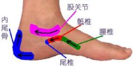 4.尾椎:在双脚内侧大拇趾往下延伸有一长条形骨头未端,在踝关节下方是尾椎反射区。按摩方法是定点揉按。