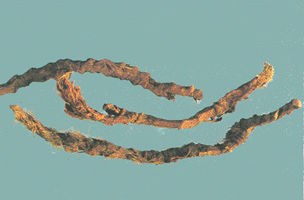 『药材性状』 本品呈扁圆柱形,多弯曲,常有分枝,长3-20cm,直径0.3-1cm。表面棕褐色,粗糙,有疏密不匀的环节,节间长0.2-0.8cm,具细纵纹,一面残留须根或圆点状根痕;叶痕呈三角形,左右交互排列,有的其上有毛鳞状的叶基残余。质硬,断面纤维性,类白色或微红色,内皮层环明显,可见多数维管束小点及棕色油细胞。气芳香,味苦、微辛。