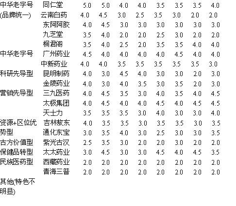 由于中药品种众多、创新难度较大,所以企业间的产品差异较小,加之中药品牌依赖度较高、自创品牌难度较大,所以我国的中药企业似有一种“千人一面”的感觉。事实上,由于中医药蕴含丰富的古代哲学和民族文化,又不断随着科技、经济的发展而发展,中药企业大多形成了各具特色的文化底蕴和竞争力。概括地讲,中药类企业可分为:品牌统一的中华老字号、品牌尚未统一的中华老字号、以科研开发和技术创新为先导的现代化中药企业、以营销拉动市场需求的新型企业、具有得天独厚的资源和区位优势的中药企业以及古方价值型企业、民族医药型企业和保健品转型医药企业。具备以上特征的上市公司大约有18家,现从行业地位、品牌价值、科研实力、新品储备、知识营销、现代管理、资本扩张和战略规划等8个方面比较其核心竞争力(见表3),并从其拳头产品的单品种销售规模和盈利能力考察其产品价值(见表4)。(南方)am21+v2, 百拇医药