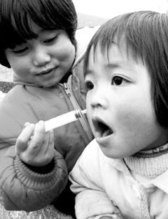 图5:村中的孩子把用过的注射器当作玩具,拿在手中玩耍。;jx, 百拇医药
