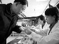 为了让更多的人了解糖尿病的防治保健知识,近日,山东省德州市人民医院内科的糖尿病专家,与二百余名糖尿病患者举行联谊会,对他们进行相关知识的宣讲,发放宣传材料,并免费为他们测血糖。图为一糖尿病患者在活动现场接受血糖检测。