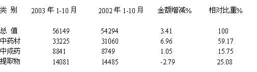 2003年,我国中药出口继续稳定增长,1~10月份,中药出口达到5.61亿美元,同比增长3.41%。其中,中药材出口3.32亿美元,同比增长6.96%;提取物出口1.41亿美元,同比下降2.79%;中成药出口8841万美元,同比增长1.05%(详见图一)。6uj, http://www.100md.com