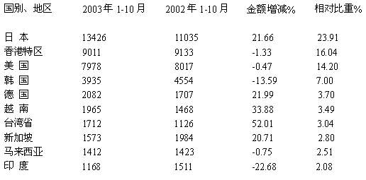 在主要出口国中,对日本的出口出现强劲增长,出口总额达1.34亿美元,同比增长21.66%;对越南的出口也大幅增长,出口1965万美元,同比增长33.88%。但对韩国、新加坡、马来西亚等传统市场的出口均出现下降,其中对新加坡出口1573万美元,下降20.71%;对马来西亚出口1412万美元,下降0.75%;对韩国出口3935万美元,下降13.59%。6uj, http://www.100md.com
