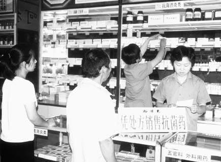 7月1日,宁夏区青铜峡市药监局工作人员到辖区药店检查未列入非处方药目录的抗菌药凭处方销售情况。图为药监人员在察看药店销售纪录。(图1)