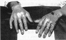 4.典型病例: 梁××,男,22岁,因被火焰烧伤头面、双手3小时急诊入院,入院时双手背表皮脱落,水肿渗出,创面基底红白相间,为典型深Ⅱ度创面(照片1)。入院后左手用10%磺胺嘧啶银包扎换药,右手及其余创面用MEBO治疗,同时用先锋霉素5号+氧哌嗪青霉素联合抗感染。伤后第三天,行左手背切痂加自体中厚皮移植术,术后2周拆开左手敷料见皮片成活(照片2),3周右手创面基本愈合。6周出院,出院时双手无功能障碍,但左手背移植皮片边缘有轻度疤痕增生(照片3)。