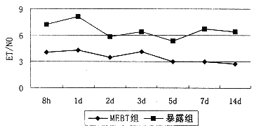 1.血浆ET、NO测定结果: 正常人血浆ET值42.8±12.2pg/m1,NO值14.5±3.6μmol/L,ET/NO之比约为2.95。表1见两组伤后8h血浆ET均迅速上升,但MEBT组在各时相上升水平均低于干燥暴露疗法组,5d后就恢复到正常水平,干燥暴露疗法组在伤后14d仍维持较高水平。表2见两组伤后8h血浆NO均迅速上升,1d起MEBT组逐渐下降,3d后恢复到正常水平,干燥暴露疗法组7d后才恢复到正常水平。图1见MEBT组1d后ET/NO就趋向于2.95,而干燥暴露疗法组各时相ET/NO远高于2.95。