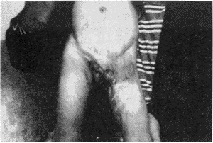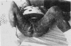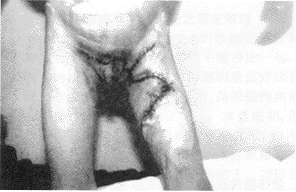 2. 外展、下蹲功能障碍,一般不涉及生殖器官功能障碍,但对髋部功能障碍的影响程度往往较重,皮肤缺损面积较大,治疗以恢复双大腿外展及下蹲功能为主要目的,充分松解瘢痕牵拉,重者分别在两大腿,自腹股沟上缘至臀皱襞外缘移植5~10cm宽的长条中厚皮片,由于均为大关节功能障碍,术后活动幅度大,加上外力作用,使皮片抗挛缩能力增强,远期效果满意。对病程较长,瘢痕已软化或形成蹼状者有时貌似严重,但通过瘢痕松解大部分可采用局部皮肤瘢痕瓣修复畸形。